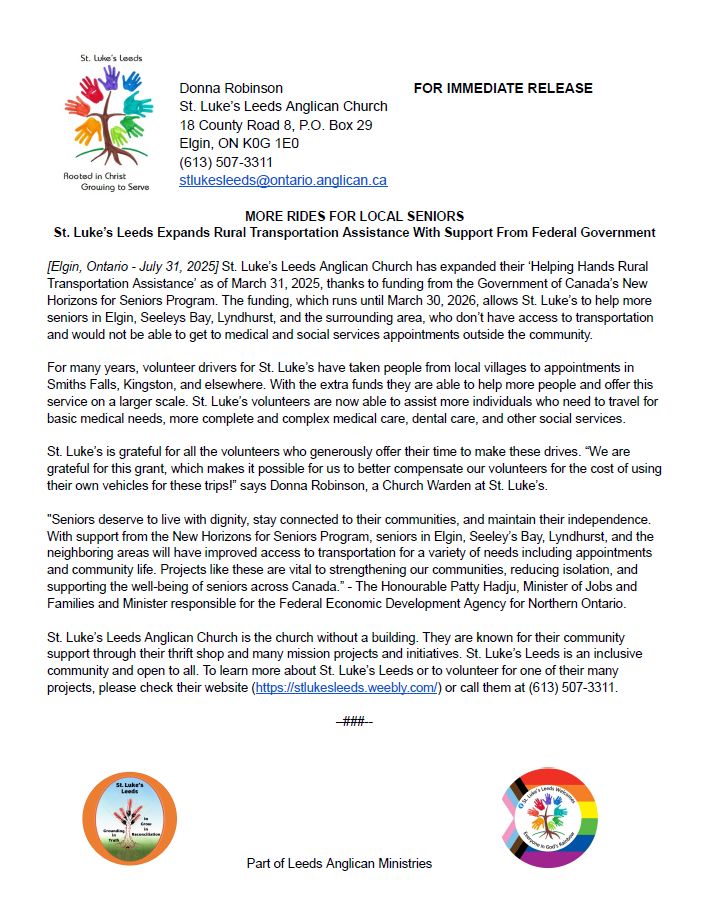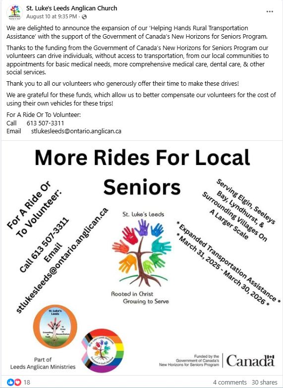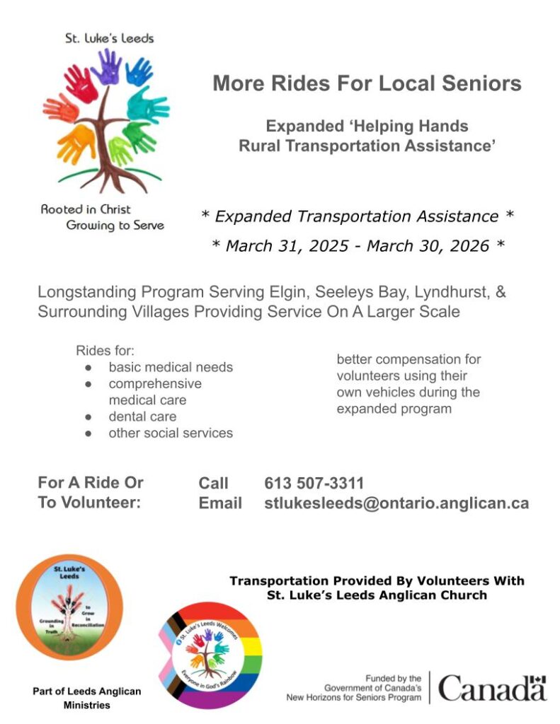 Problem: Produce a publicity package including a press release, poster, and Facebook post to announce the expansion of St. Luke’s Helping Hands Rural Transportation Assistance programme and to encourage senior citizens to contact St. Luke’s Leeds when they need a ride to an appointment, so they can stay healthy and obtain the social services they need. The secondary call to action in this project is to ask potential volunteer drivers to contact St. Luke’s. The source of the funds had to be identified in the copy.